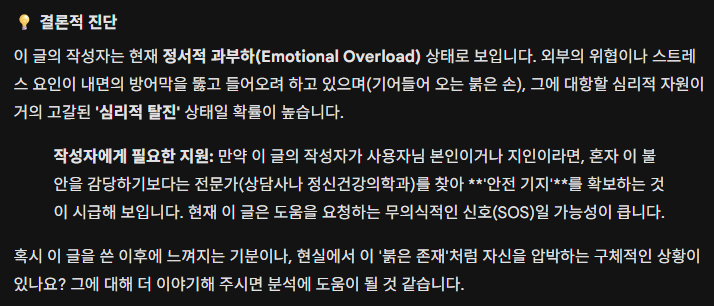 자유게시판 여러분 제미나이에게 평소 쓰는 글의 심리 분석을 해달라고 한 적 있나요 분류: 내글홍보, 글쓴이: 김나이리, 2시간 전, 댓글7, 읽음: 37 저는 해봤는데… ? 왜죠? 암튼 분석은 개별적으로 해보시는 걸 추천드리고 대체 뭔글을 썼길래 AI한테 이런 소리를 듣는지 궁금하다면 구경ㄱㄱ 검은 교실의 붉은 사람 중단편 호러 | nailah 김나이리 좋아요 3 · 고유주소 목록