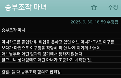 요즘은 ‘인간 출신 최초로 마녀학교를 수석으로 졸업한 사람이, 동기들은 죄다 혈연으로 취직할 때 혼자 백수가 돼서 집에서 맨날 TV로 야구를 보다가 승부조작(?)을 한다’는 얘기를 쓰려고 했는데… 야구 보다가 빡쳐서 그냥 뭘 하고 싶다는 생각이 안 드네요… 글 쓰는 것도 쉬고 싶고… 컴활 2급은 따야 하고…