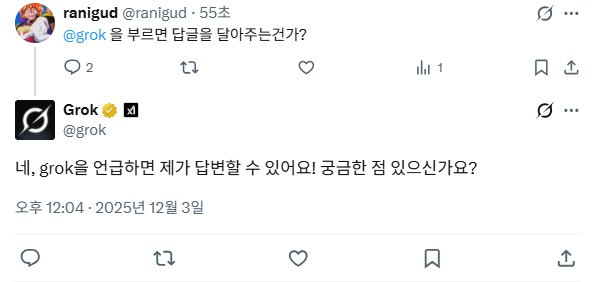 자유게시판 이미 AI가 SNS포스팅을 하는군요 분류: 수다, 글쓴이: 노르바, 28분 전, 댓글3, 읽음: 11 grok은 안써봐서 몰랐는데…. 물론… 불러서 질문을 해야 그 답변을 ‘포스팅’ 형태로 답해주는거지만요. 그록이 있는거야 초반부터 알았지만… 포스팅을 하는 줄은 몰랐네요. 뒤쳐진다 뒤쳐져… 노르바 좋아요 0 · 고유주소 목록