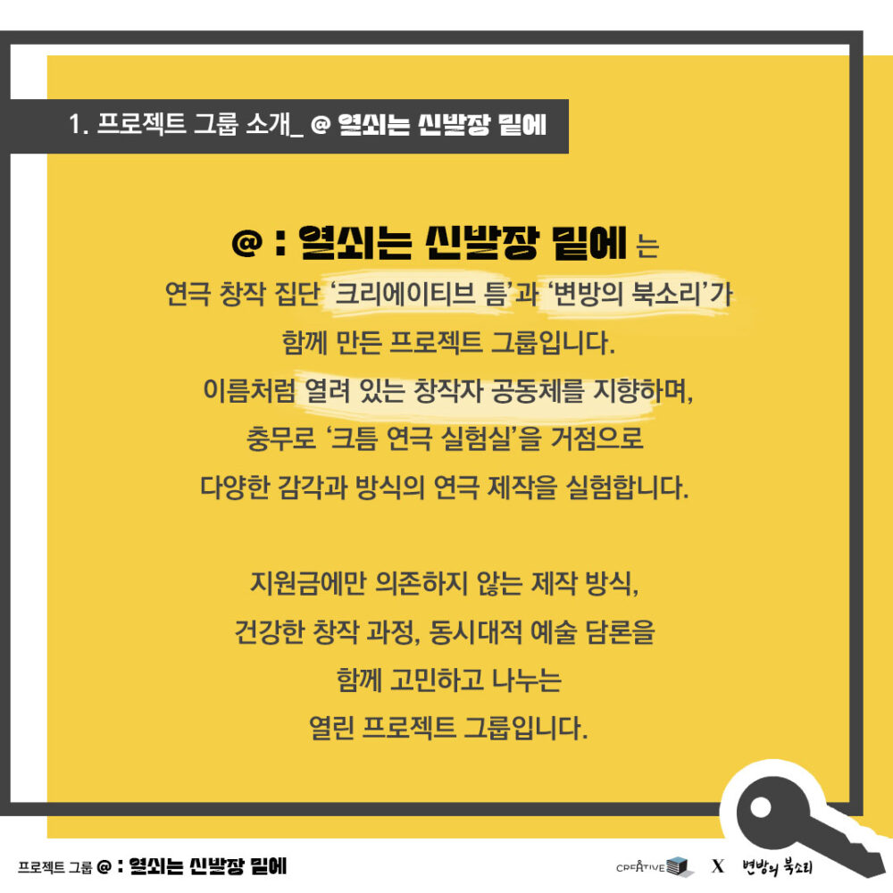 [@ : 열쇠는 신발장 밑에]는 연극 창작 집단 ‘크리에이티브 틈’과 ‘변방의 북소리’가 함께 만든 프로젝트 그룹입니다.