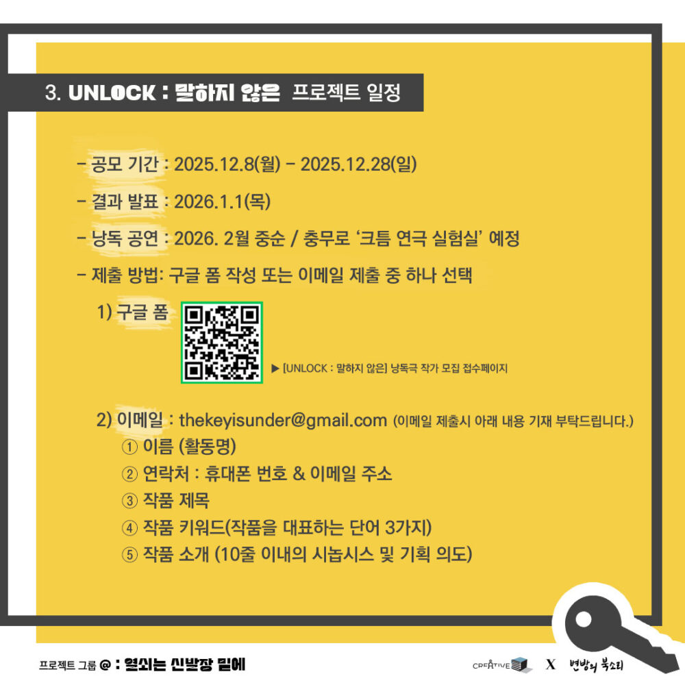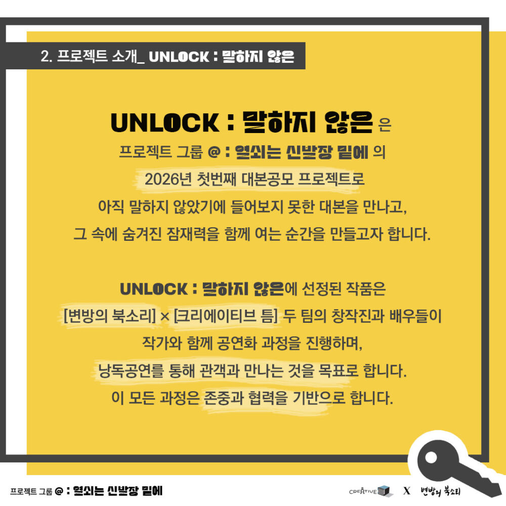 [UNLOCK : 말하지않은]에 선정된 작품은 [변방의 북소리] × [크리에이티브 틈] 두 팀의 창작진과 배우들이 작가와 함께 공연화 과정을 진행하며, 낭독공연를 통해 관객과 만나는 것을 목표로 합니다. 이 모든 과정은 존중과 협력을 기반으로 합니다.