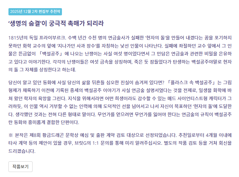 자유게시판 와 클스마스 선물 분류: 내글홍보, 글쓴이: 노르바, 5시간 전, 댓글11, 읽음: 52 와 추천작 선정 알람 눌렀다가 깜놀해서 쓰던 리뷰 날릴뻔… 예 그러니까 또 홍보 드가게씁니다 플라스크 속 백설공주-욕망의 연금술에 관한 기록 중단편 추리/스릴러, 판타지 | 노르바 많관부 많관부 덧글 좋아합니다 빨간 알림 노르바 좋아요 9 · 고유주소 목록