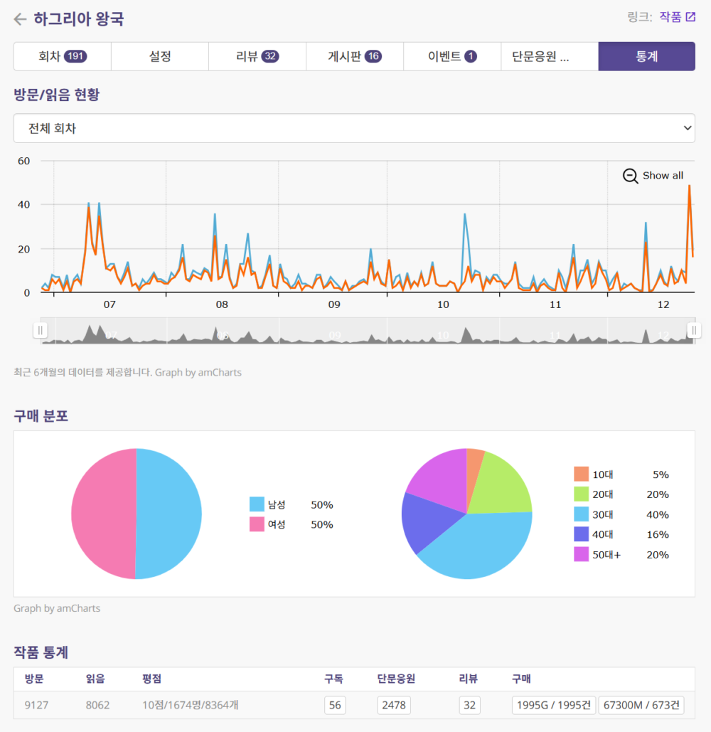 이것은 2025년 12월 24일 오후 2시 25분 <하그리아 왕국>의 통계입니다. 독자님들의 성별이 여성 50퍼센트, 남성 50퍼센트로 완벽한 반반이 되었습니다. 독자님들의 연령대는 40퍼센트가 30대로 제일 많습니다. 구독하신 분들은 56명이고 리뷰글이 총 32개입니다. 2026년엔 더 많은 독자님들께 구독과 리뷰글을 받고 싶습니다. 방문은 9천 횟수가 넘고, 읽음은 8천 횟수가 넘는데, 2026년에는 방문과 읽음 횟수가 각각 1만을 넘기길 바랍니다.