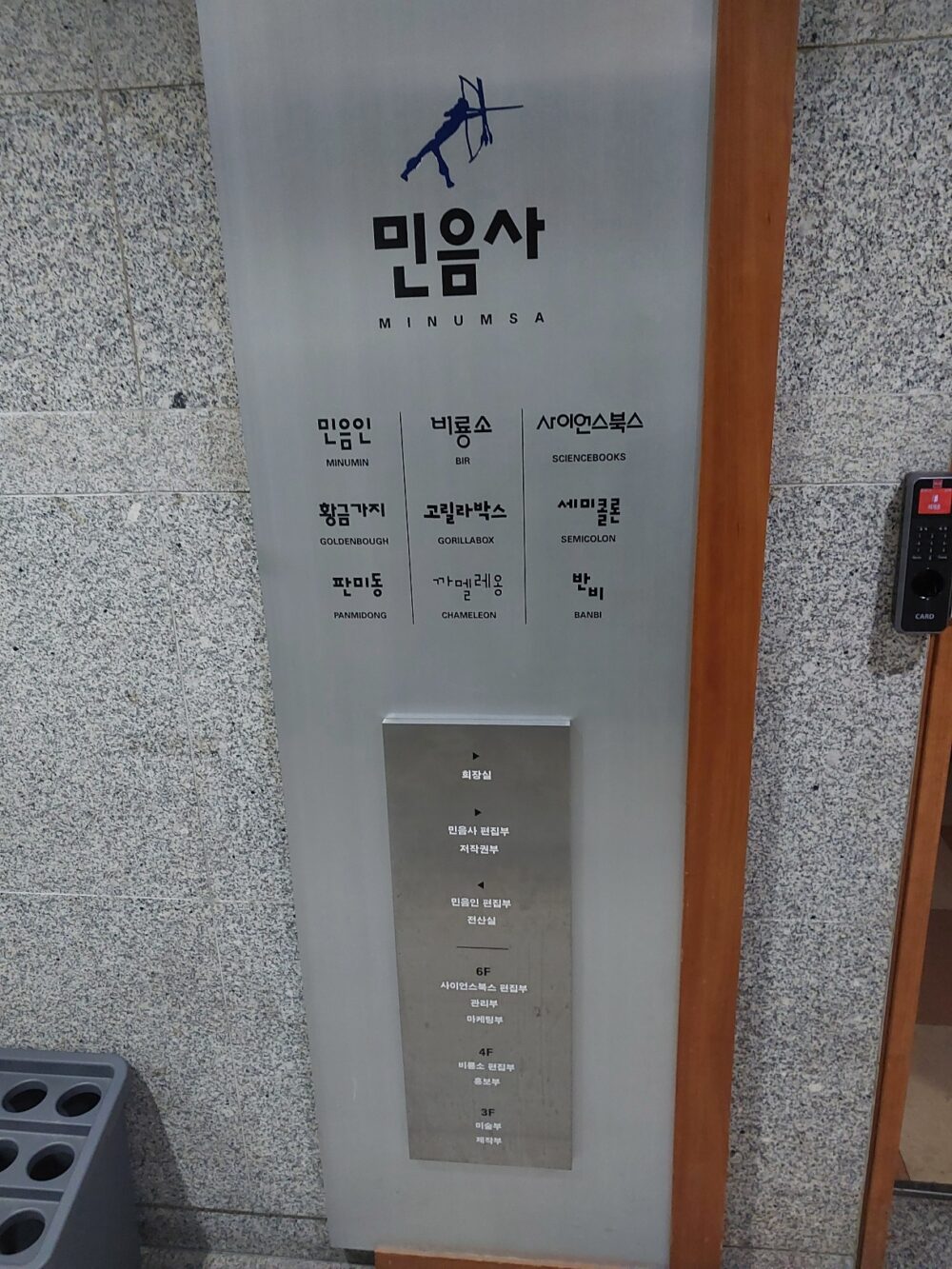 그리고 엘리베이터가 열리자마자 비좁은 복도와 함께 민음사 명패가 뙇! 하고 반겨줍니다.