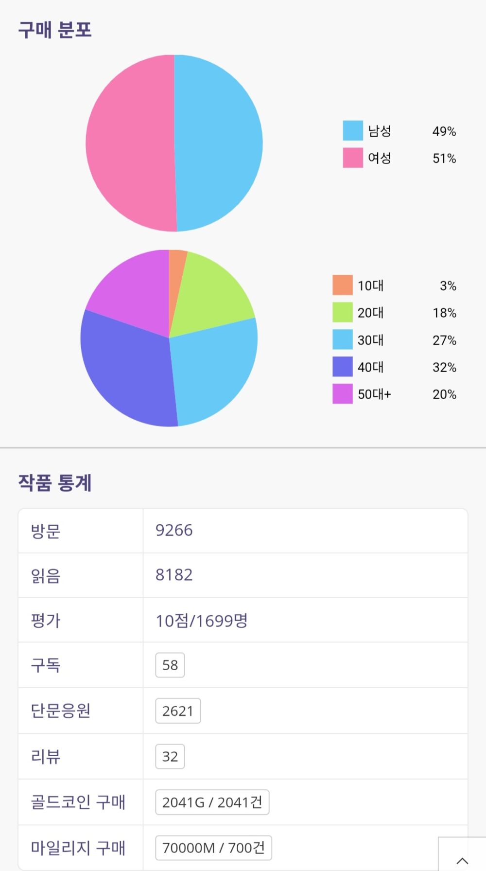 <하그리아 왕국>의 구매 분포에서 51퍼센트가 여성독자들이며, 가장 많은 32퍼센트가 40대 독자들입니다.