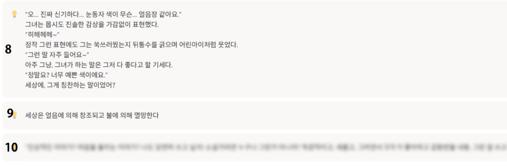 8번이 그… ‘얼음과 불의 세레나데’의 그 장면인데 ㅎㅎ 원래는 저러했습니다… 원래는… 로판에서 하도 찬바람 부는 남주 묘사를 눈빛이 얼음장 같다 그러길래… 한번 비틀고 두번 비틀어서… ‘눈빛이 얼음장 같다’ 라고 대놓고 말하는 여주와, 그걸 또 곧이곧대로 받아들이는… 헤헤거리는 남주면… 심지어 그게 사실 칭찬이었으면… 웃기겠다… 싶어서…