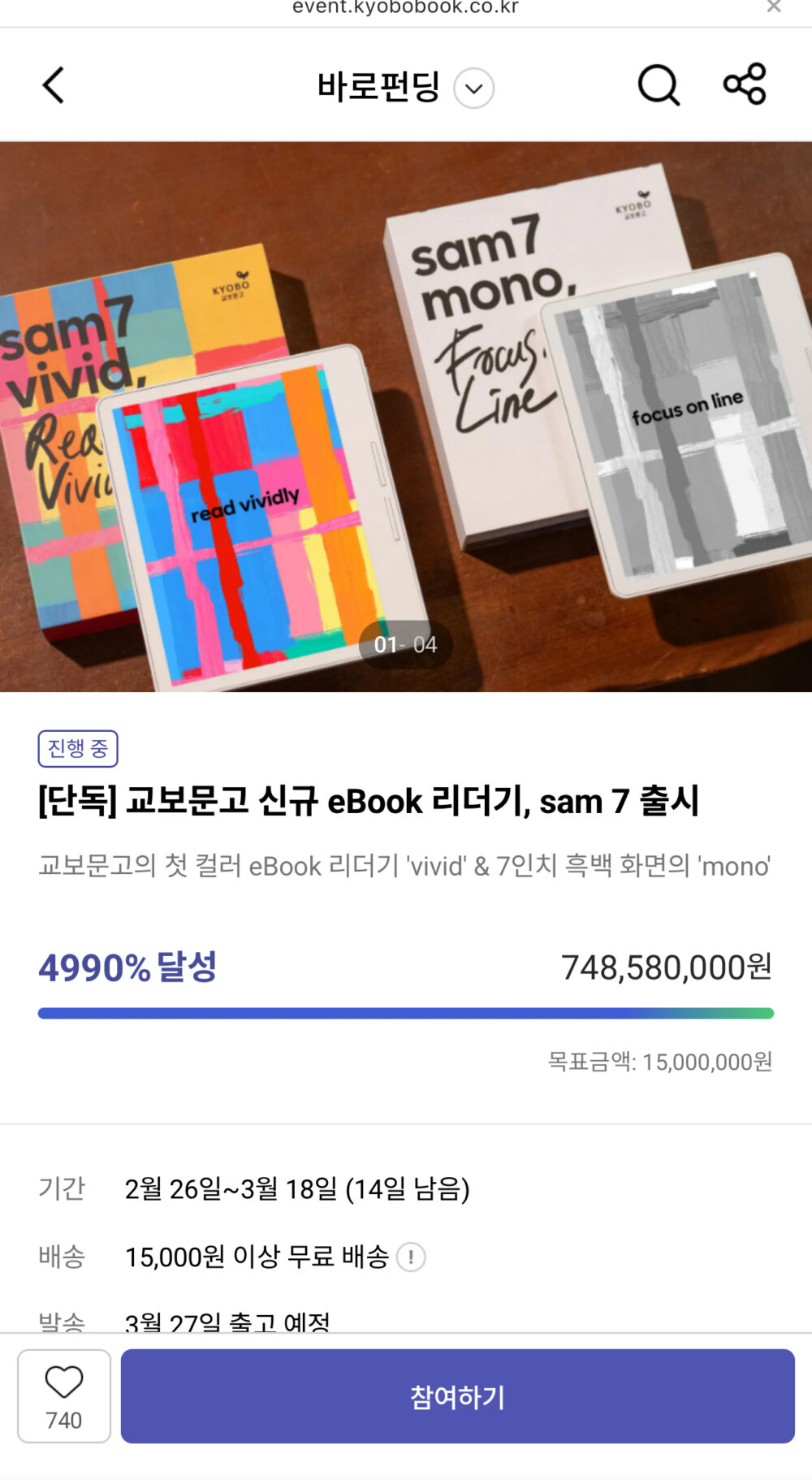교보에서 이북리더기 새로 내면서 펀딩 중인데 7억을 넘기고 3차 추가 물량까지 순식간에 마감되어 버렸어요.