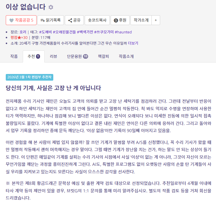 자유게시판 어? 분류: 내글홍보, 글쓴이: 노르바, 2시간 전, 댓글2, 읽음: 47 두번째다아아아아 이상 없습니다 중단편 호러 | 노르바 조아써 대충 방향 감잡음 감사합니다 감사합니다 딴거 퇴고하러 가게씀미다 노르바 좋아요 11 · 고유주소 목록