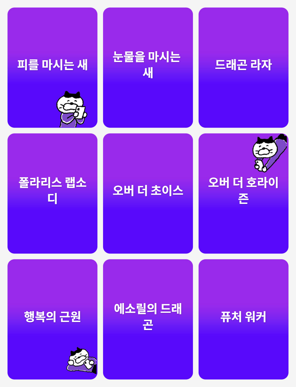 근데 사실 이럴 거면 차라리 맨 위에 이영도 타자의 전작이라는 카테고리로 묶어서 나머지 8칸을 다른 작품으로 채우는 게 나았을 거 같긴 한데……