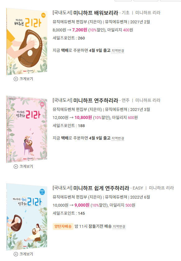 ‘미니하프’는 따로 있는데, 뭐 어찌저찌 하다보니 그렇게 된건지 ‘미니하프 리라’ 라고 검색하면 이렇게 생긴 애가 나옵니다. 줄 개수에 따라서도 또 몇개 있긴 합니다.