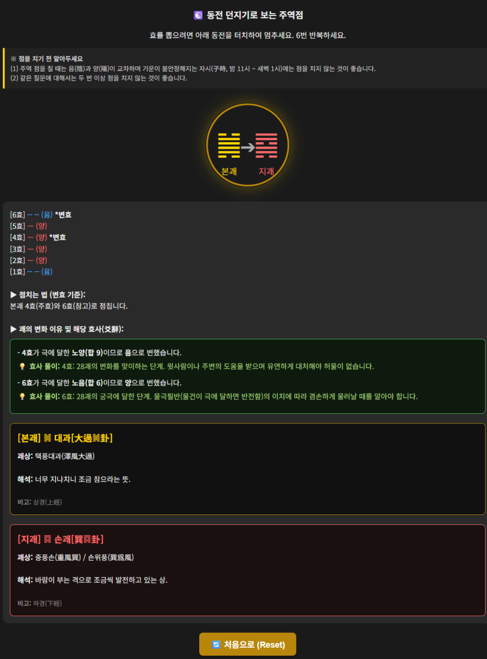 웹 앱 하나 더 만들어 봤습니다. (동전으로 주역 점 치기)