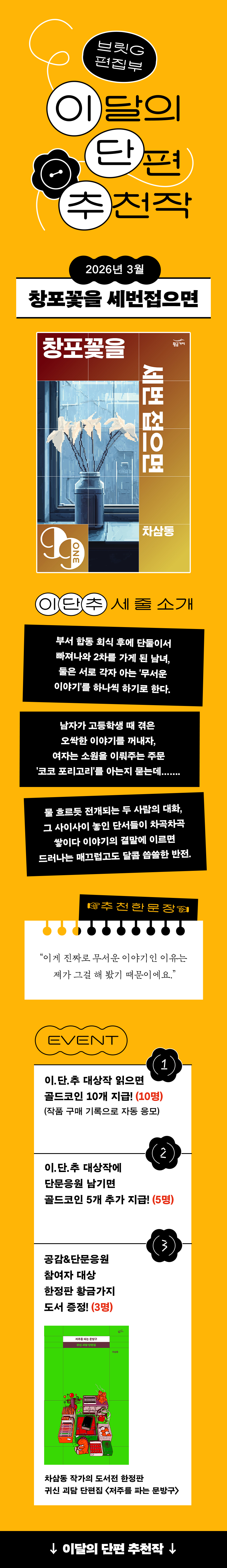 3월 브릿G 편집부 ‘이단추’를 소개합니다.🌼 2026.3.3 창포꽃을 세 번 접으면 중단편 판타지, 호러 | Xx 편의점 괴담 중단편 호러 | 세미제인 [소소한 괴담] 5. 이세계로 가는 엘리베이터 중단편 호러 | 신진오 병원의 비상구 중단편 호러, 추리/스릴러 | 에이켄 우산을 빌려주시겠어요? 중단편 호러, 추리/스릴러 | 나기 안내 사항 이벤트로 적립된 골드코인은 발급일로부터 30일간 유효합니다. 작품에 리뷰를 남기면 당첨 확률이 높아집니다. 이벤트 날짜와 경품은 변경될 수 있습니다.