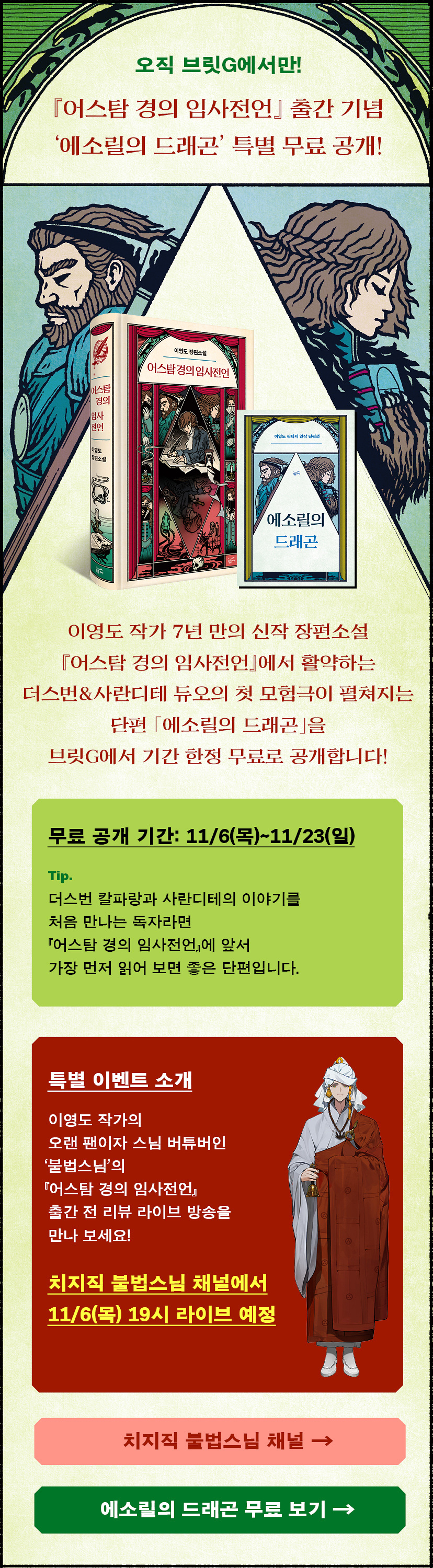 ‘에소릴의 드래곤’ 브릿G 특별 무료 공개(11/6~23) 이벤트!🐉 2025.11.3 더스번 칼파랑&사란디테 시리즈 모아 보기! 더스번 칼파랑과 사란디테 이야기 – 에소릴의 드래곤 중단편 판타지 | 이영도 출판 더스번 칼파랑과 사란디테 이야기 – 샹파이의 광부들 1 중단편 판타지 | 이영도 출판 더스번 칼파랑과 사란디테 이야기 – 샹파이의 광부들 2 중단편 판타지 | 이영도 출판 더스번 칼파랑과 사란디테 이야기 – 에피소드: 스페란 도서전에서 중단편 판타지 | 이영도 출판 ※ 더스번 칼파랑&사란디테 듀오의 신작 추리극 『어스탐 경의 임사전언』 역시, 11/19(수)부터 브릿G 및 카카오페이지에서 연재로 만나 보실 수 있습니다. ※