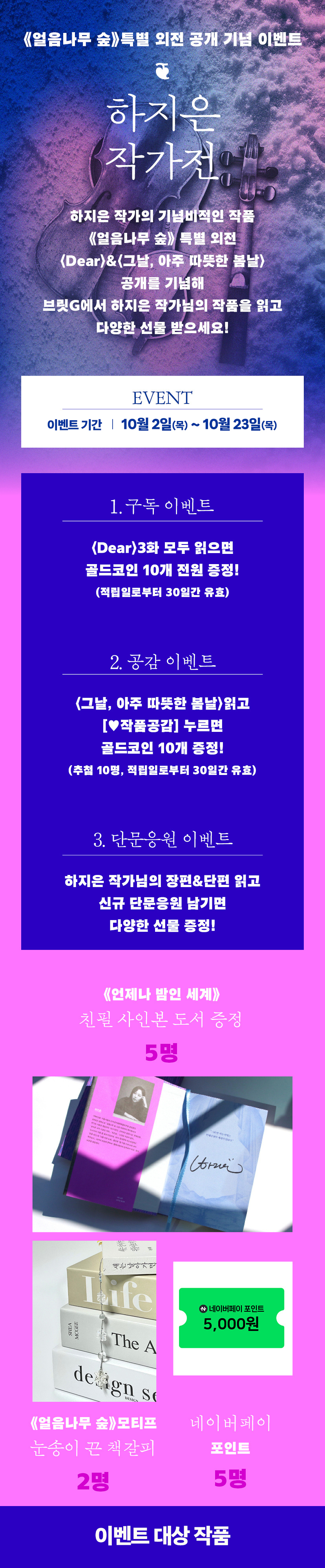 ‘얼음나무 숲’ 특별 외전 공개 기념 작품 열람 이벤트!❄️ 2025.10.2 언제나 밤인 세계 연재 판타지, 호러 | 하지은 얼음나무 숲 연재 판타지, 추리/스릴러 | 하지은 출판 얼음나무 숲 외전 연재 판타지, 추리/스릴러 | 하지은 출판 보이드 씨의 기묘한 저택 연재 판타지, 추리/스릴러 | 하지은 출판 눈사자와 여름 연재 판타지, 추리/스릴러 | 하지은 출판 오만한 자들의 황야 연재 판타지 | 하지은 출판 모래선혈 연재 판타지 | 하지은 출판 야운하시곡(夜雲下豺哭) (상) 중단편 무협 | 하지은 나를 위한 노래 중단편 기타 | 하지은 타당한 분노 중단편 기타, 일반 | 하지은 지구상 나의 마지막 청중 중단편 일반, 기타 | 하지은 그날, 아주 따뜻한 봄날 중단편 판타지, 로맨스 | 하지은 안내 사항 이벤트로 적립된 골드코인은 발급일로부터 30일 유효합니다. 작품에 단문응원 및 리뷰를 남기면 당첨 확률이 높아집니다. 이벤트 날짜와 경품은 변경될 수 있습니다.