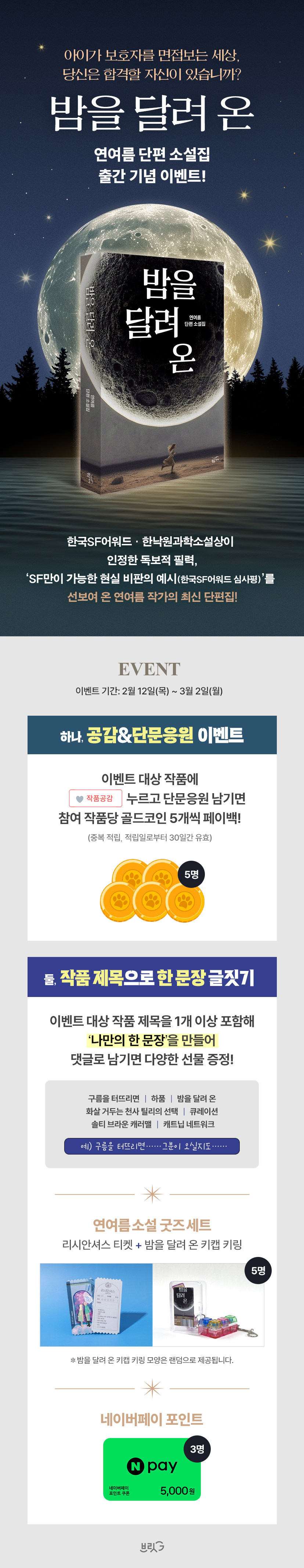 연여름 작가 신작 ‘밤을 달려 온’ 출간 기념 이벤트🌕 2026.2.12 구름을 터뜨리면 중단편 SF, 일반 | 연여름 하품 중단편 SF, 일반 | 연여름 밤을 달려 온 중단편 판타지, SF | 연여름 화살 거두는 천사, 틸리의 선택 중단편 판타지, 로맨스 | 연여름 큐레이션 중단편 판타지, 호러 | 연여름 솔티 브라운 캐러멜 중단편 판타지, SF | 연여름 캐트닙 네트워크 중단편 판타지 | 연여름 안내 사항 단편집 수록작 중 「스왈로우 탐정 사무소 사건 보고서」는 브릿G에 작품이 게재되지 않아 이벤트에서 제외되었음을 알려 드립니다. 공감&단문응원 이벤트 최대 적립 골드코인은 35개이며, 유효 기간은 발급일로부터 30일입니다. 이벤트 대상 작품에 리뷰를 등록하시면 당첨 확률이 높아집니다. 이벤트 날짜와 경품은 변경될 수 있습니다.