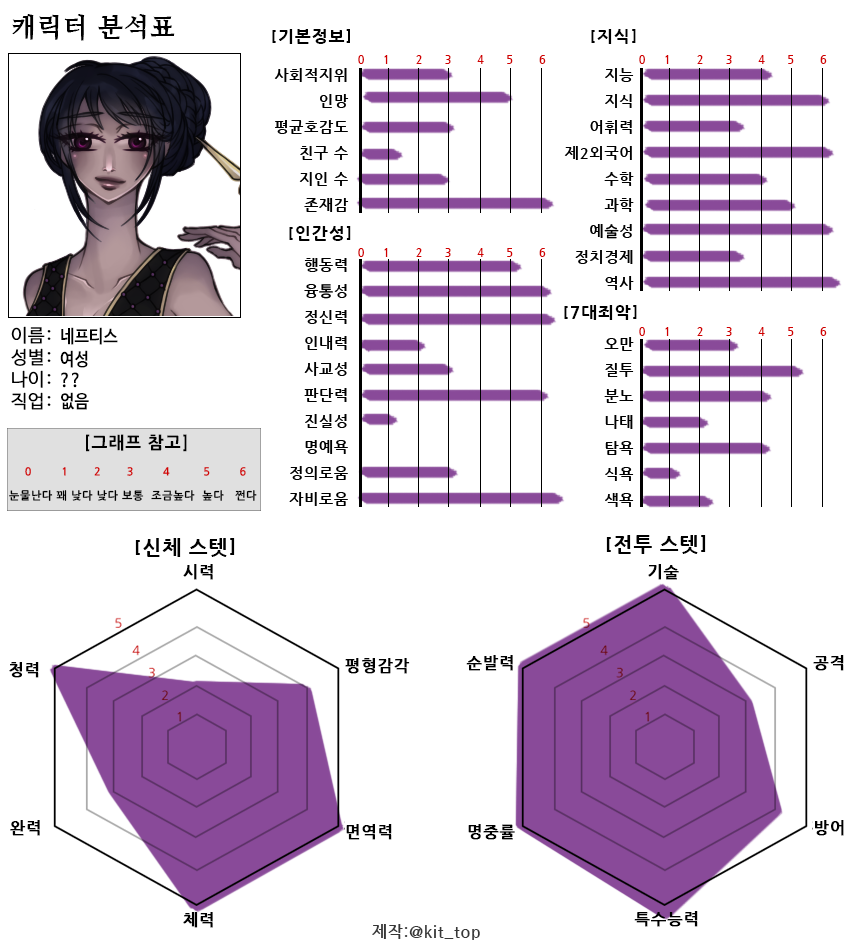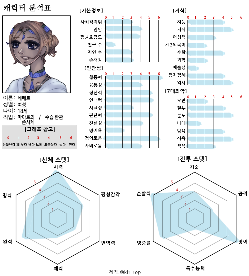 세티 주 평민출신의 수습 판관으로, 위로는 오빠 한 명, 아래로는 남동생 하나, 여동생 둘을 두고 있다. 오랜 가뭄으로 영지 전체가 가물었던 세티 주 중에서도 특히나 가난한 집안으로, 대체로 굶는 것이 일상인 유년기를 보내다, 세티 주에 행차한 파라오 세메르케트와 재상 람세스의 눈에 들어 이세트 가문의 후원을 받기 시작했다. 마아트 신전의 고위 사제에게 사사받아 마아트 신전에 입교, 그대로 수습 판관이 되었다. 매사에 성실하며 똑부러지는 성격으로, 대체로 주변 모든 사람들에게 상냥한 편이지만 부모와의 사이는 그렇게 좋지 않다. 손위 형제와 함께 나머지 다섯 식구들의 생계를 책임지는 가장. 네페르가 가진 책임감은 강박관념에 가깝다.