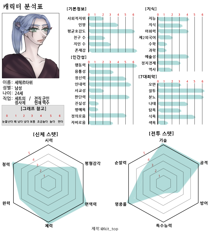 출신 불명의 고아. 양어머니 네프티스가 호적상 유일한 가족으로, 눈이 불편한 양어머니를 몹시도 아끼는 편. 8년 전 나일 제국군에 입대하였으며, 제대 전 같은 세페드 안후르 소대의 말단 황족 출신 조세르 눈 호르엠-헤브와는 절친한 친구사이. 겉보기에 냉소적이고 쌀쌀맞은 성격이지만, 몇 없는 친인들에게는 무척 살가운 편으로, 사실은 누구보다도 정이 깊고 마음이 여리다. 아스완 시민으로 입적되기 전인 9년 전의 행적은 알려지지 않았다. 나일 제국 최고의 미인으로 불리는 아마일지크와 쌍벽을 이루는 외모에도 불구하고 사생활을 공유하는 사람들이 지극히 한정되어 있어 아마일지크보다 더욱 외모적으로 경외시 되는 일이 많다. 친인들을 제외하면 신체접촉을 상당히 기피하는 편.