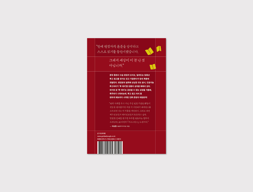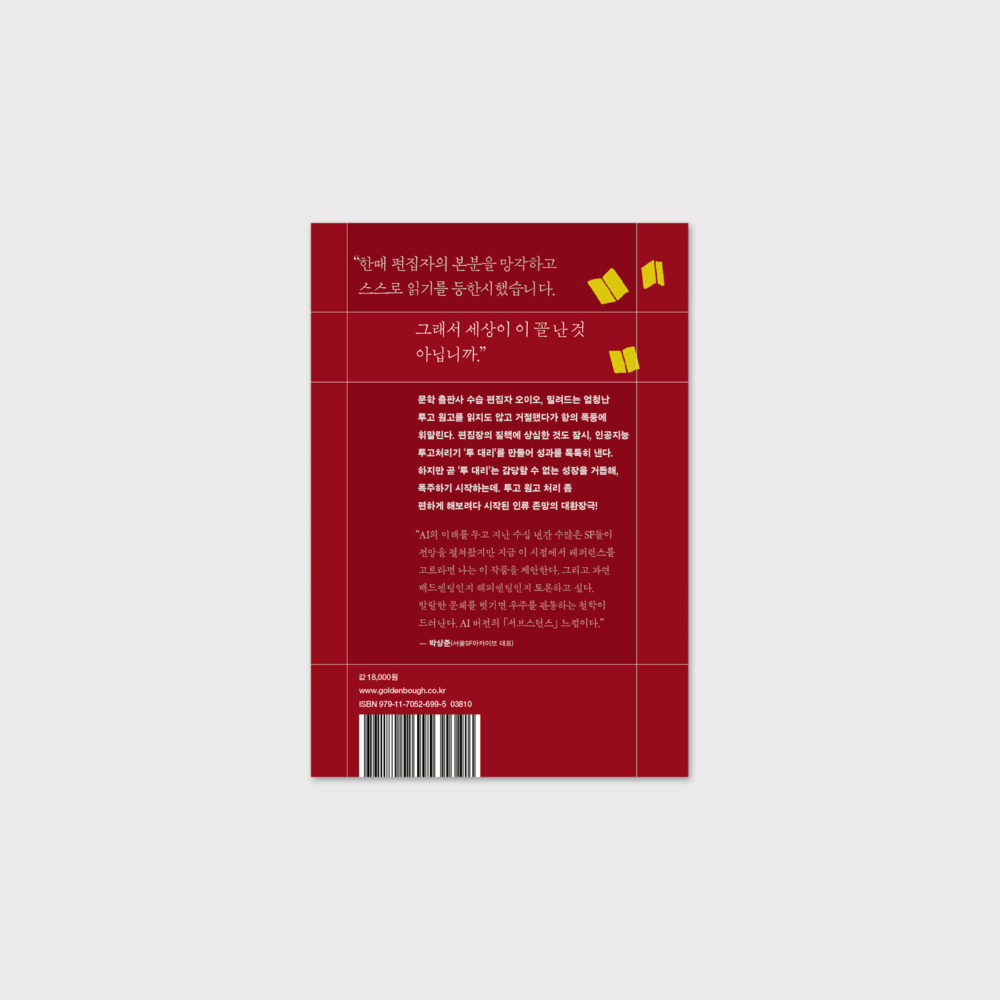 그리고 과연 배드엔딩인지 해피엔딩인지 토론하고 싶다. 발랄한 문체를 벗기면 우주를 관통하는 철학이 드러난다. AI 버전의 「서브스턴스」 느낌이다.”-박상준(서울SF아카이브 대표, 평론가)