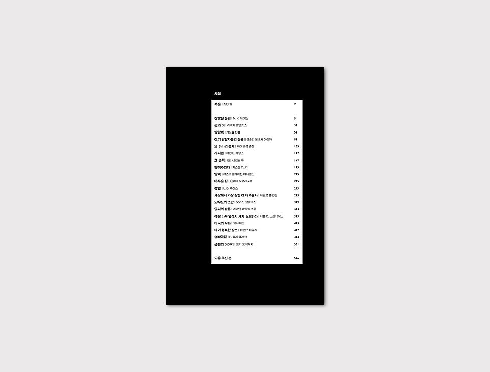 아이티를 배경으로 어린아이를 납치해 가는 인어가 등장하는 「라시렌」, 나이지리아의 장례식에서 목격한 토착 악령이 주인공을 쫓아 미국의 집까지 따라온다는 「어두운 집」, 가족의 목숨을 앗아 간 카리브해의 괴물을 퇴치하다가 저주를 받은 소녀의 이야기를 다룬 「세상에서 가장 강한 여자 주술사」는 국내 독자들에게는 다소 생소한 지역과 문화권의 소재를 현대적으로 재해석했다. 한편 SF 장르 문법을 십분 활용해 암울한 미래를 그린 작품들도 있는데, 「아기 강탈자들의 침공」은 학습을 거쳐 가임기 여성의 몸에 침투하며 닥친 인류의 위기를 보여 준다. 「탐미주의자」는 고도로 설계된 유전자 조작 생명체가 유희거리로 소비되는 세상을 그리며, 「네가 행복한 장소」는 인간의 두뇌를 기계에 연결해 신체를 통제하는 형무소의 프로젝트를 통해 비자발적 노예 상태에 관해 고찰한다. 희곡의 형식을 띤 마지막 작품 「근원의 이야기」는 역으로 변화하는 시대상에 따라 자신들이 실존적 위기에 처했다고 느끼는 백인 소년들의 논쟁을 그린다.