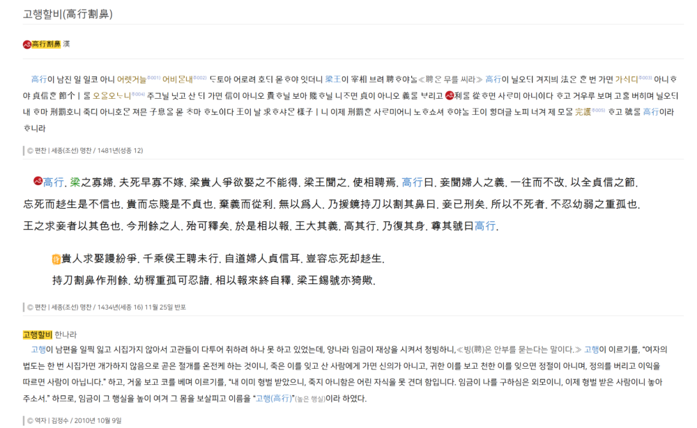 사진출처 : 세종한글고전, 삼강행실열녀도, “고행할비(高行割鼻)” (검색시간 : 2026년 2월 23일 저녁 8시 4분)